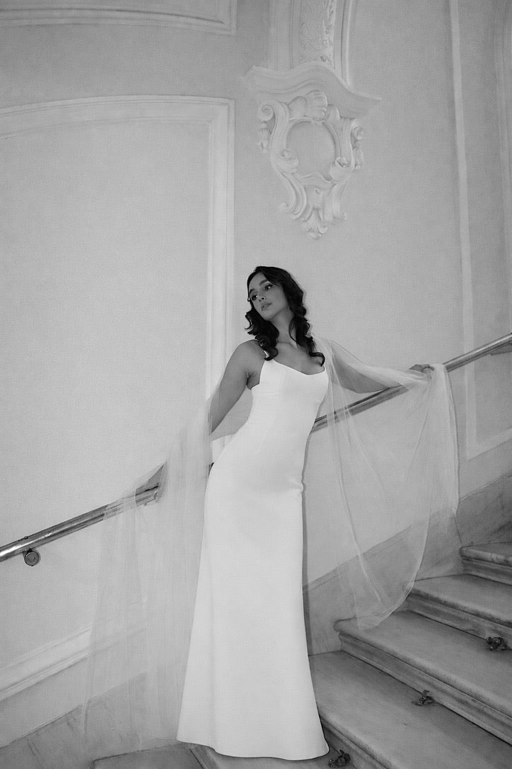 A hátul elhelyezett slicc biztosítja a szabad mozgást, így a Venus Dress nemcsak látványában, hanem viselésében is könnyed marad. Ideális választás modern menyasszonyok számára, akik egy egyszerű, mégis karakteres ruhát keresnek, és a visszafogott eleganciát határozott női jelenléttel szeretnék ötvözni.